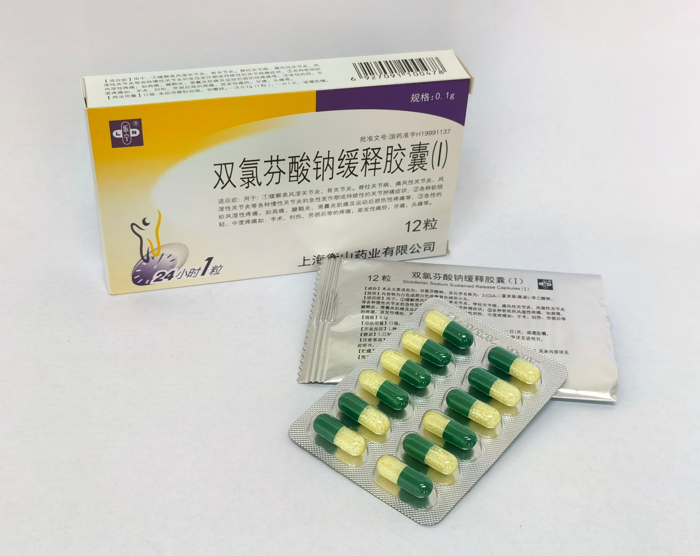適應(yīng)癥: ①緩解類風(fēng)濕關(guān)節(jié)炎、骨關(guān)節(jié)炎。脊柱關(guān)節(jié)病、痛風(fēng)性關(guān)節(jié)炎、風(fēng)濕性關(guān)節(jié)炎等各種慢性關(guān)節(jié)炎的急性發(fā)作期或持續(xù)性的關(guān)節(jié)腫疼癥狀;②各種軟組織風(fēng)濕性疼痛,如肩痛、腱鞘炎、滑囊炎肌痛及運(yùn)動(dòng)后損傷性疼痛等;③急性的輕、中度疼痛如:手術(shù)、創(chuàng)傷、勞損后等的疼痛,原發(fā)性痛經(jīng),牙痛,頭痛等。規(guī)格:0.1g包裝規(guī)格:12粒/盒備注:醫(yī)保甲類批準(zhǔn)文號:國藥準(zhǔn)字H19991137產(chǎn)品名稱:雙氯芬酸鈉緩釋膠囊(I)英